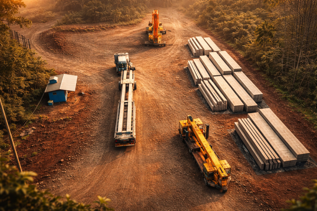 Os primeiros caminhões chegaram ao terreno, trazendo consigo o início concreto da construção.
