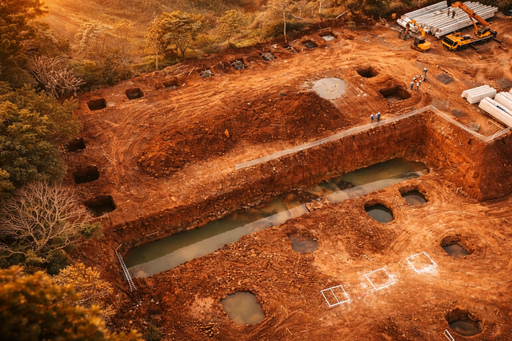 Fortes chuvas trouxeram desafios, exigindo drenagem antes da continuidade da obra. Mesmo assim, cada obstáculo revelou aprendizados e ajustes importantes.
