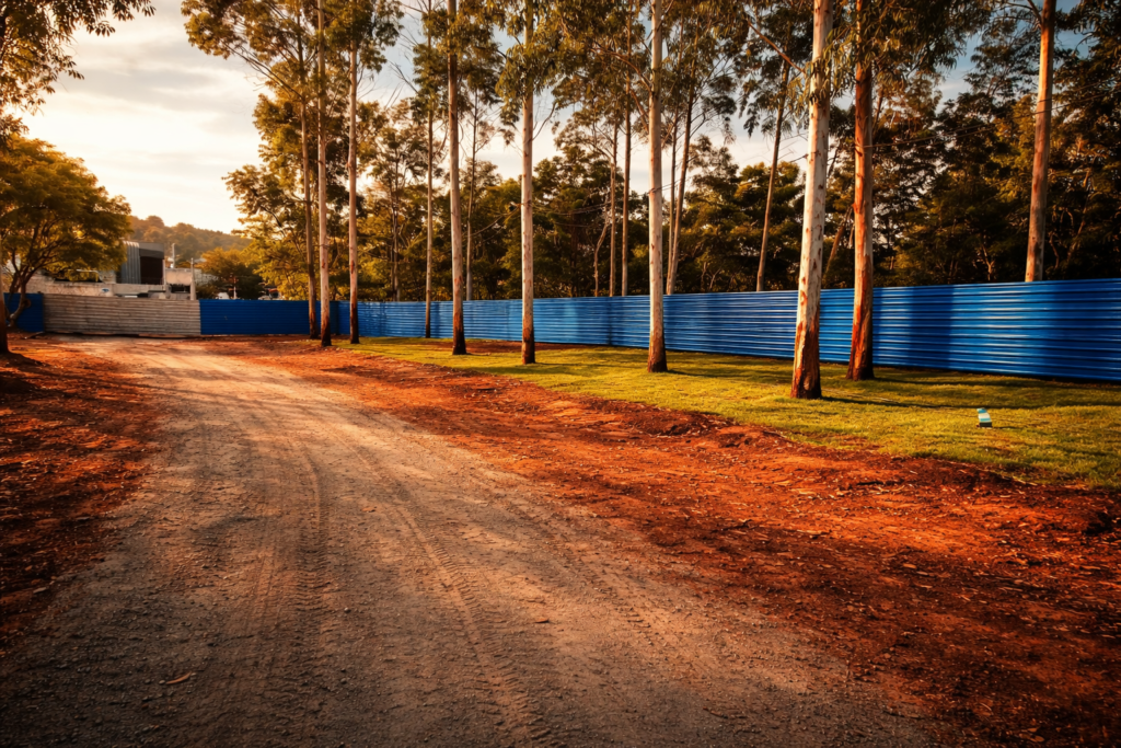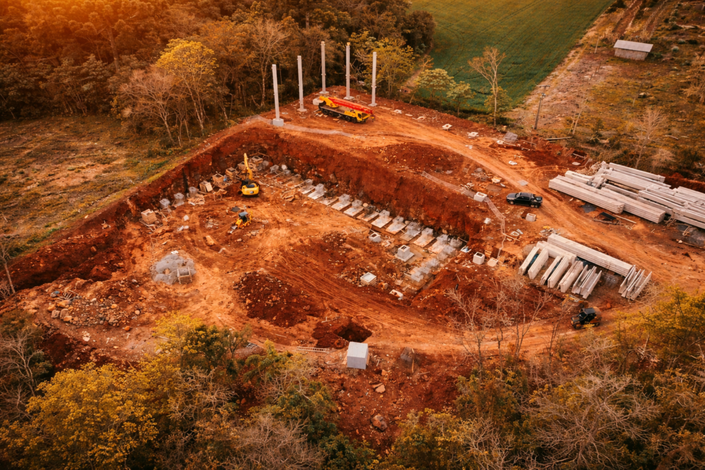 Com a retirada das madeiras, o solo foi preparado para receber a obra. A terraplanagem marcou o início visível da construção.